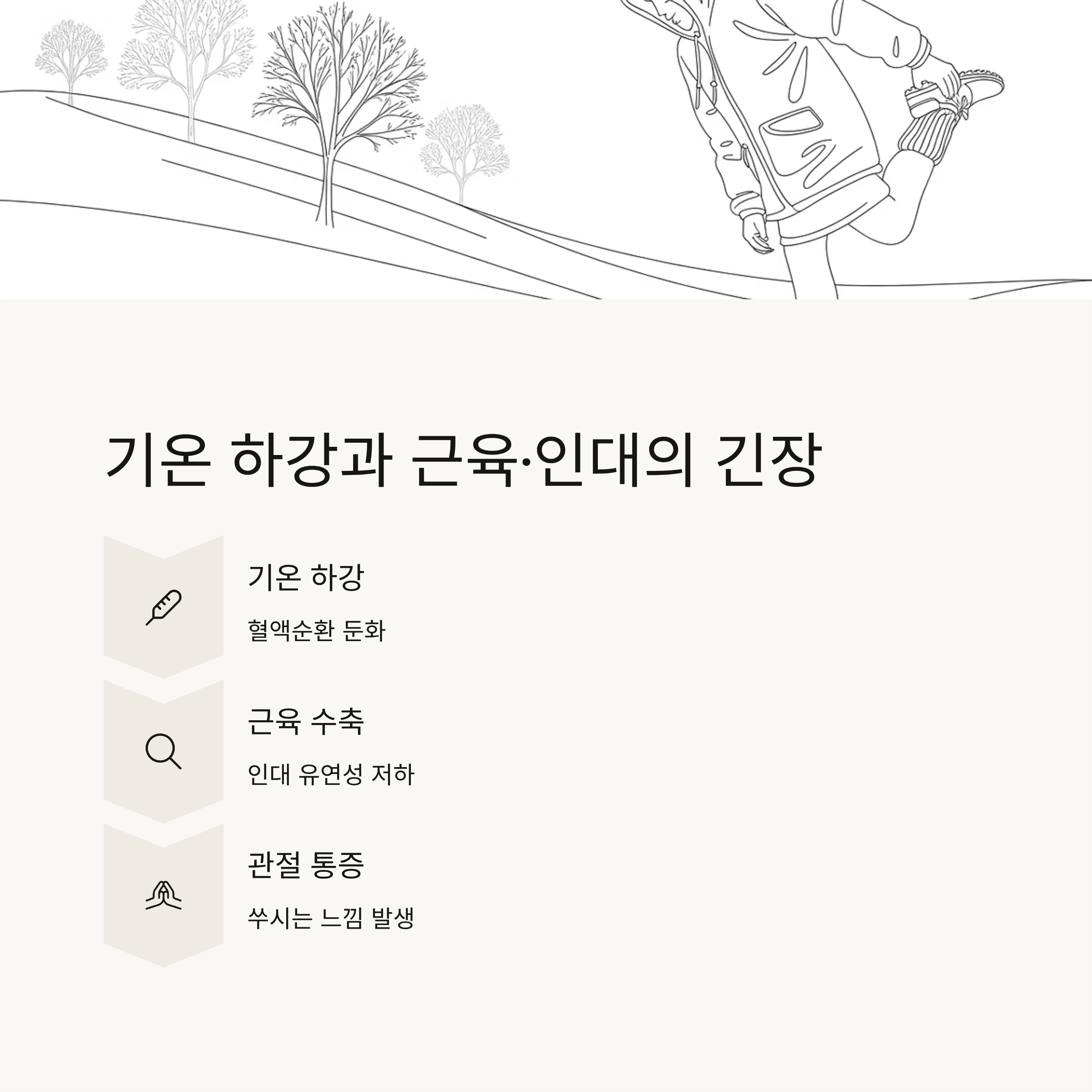 | 기온 하강 | 근육·인대 경직 → 유연성 저하 | 움직임 제한, 통증 |