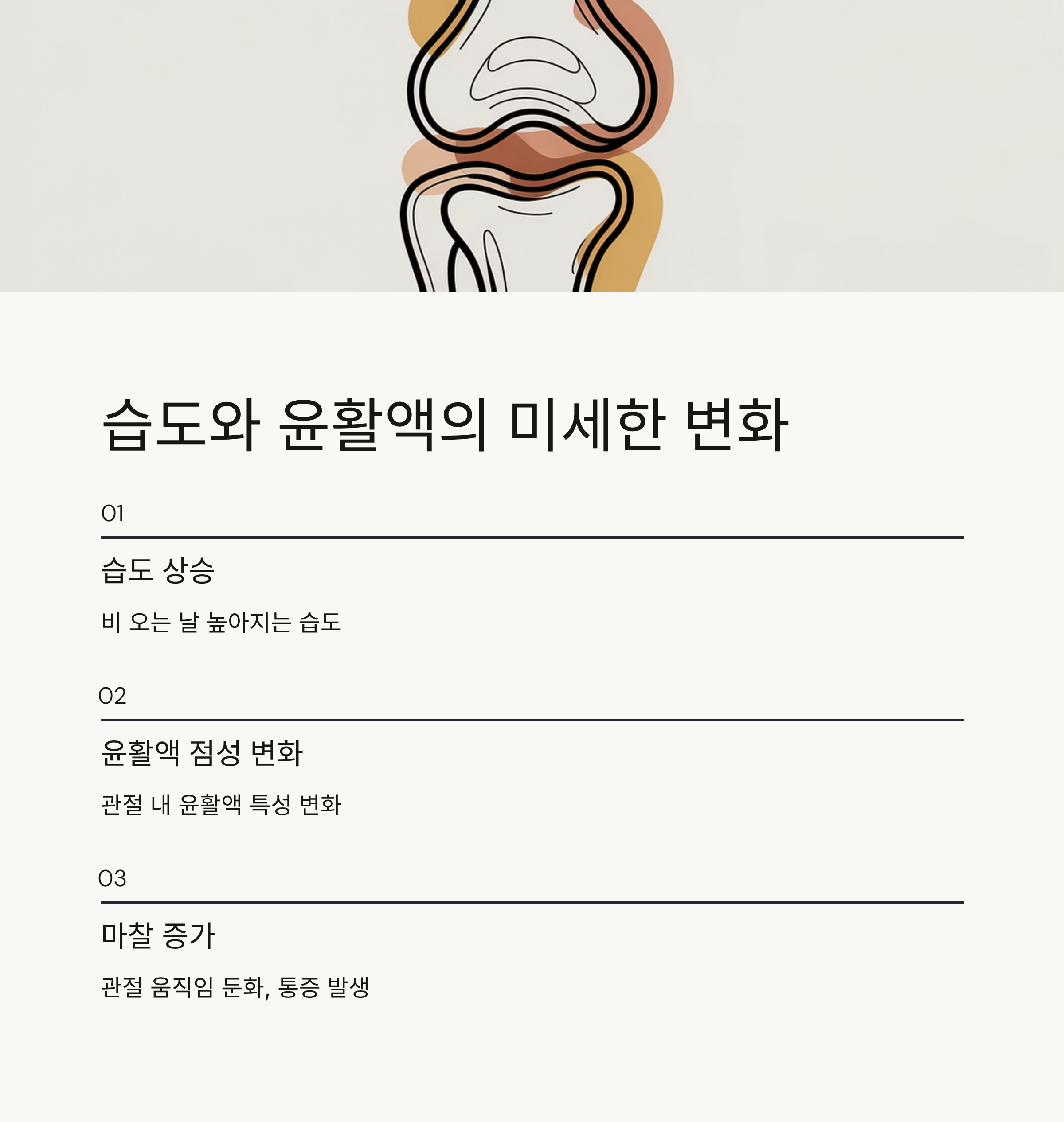 | 습도 상승 | 관절액 점성 변화 → 마찰 증가 | 관절 둔함, 뻣뻣함 |