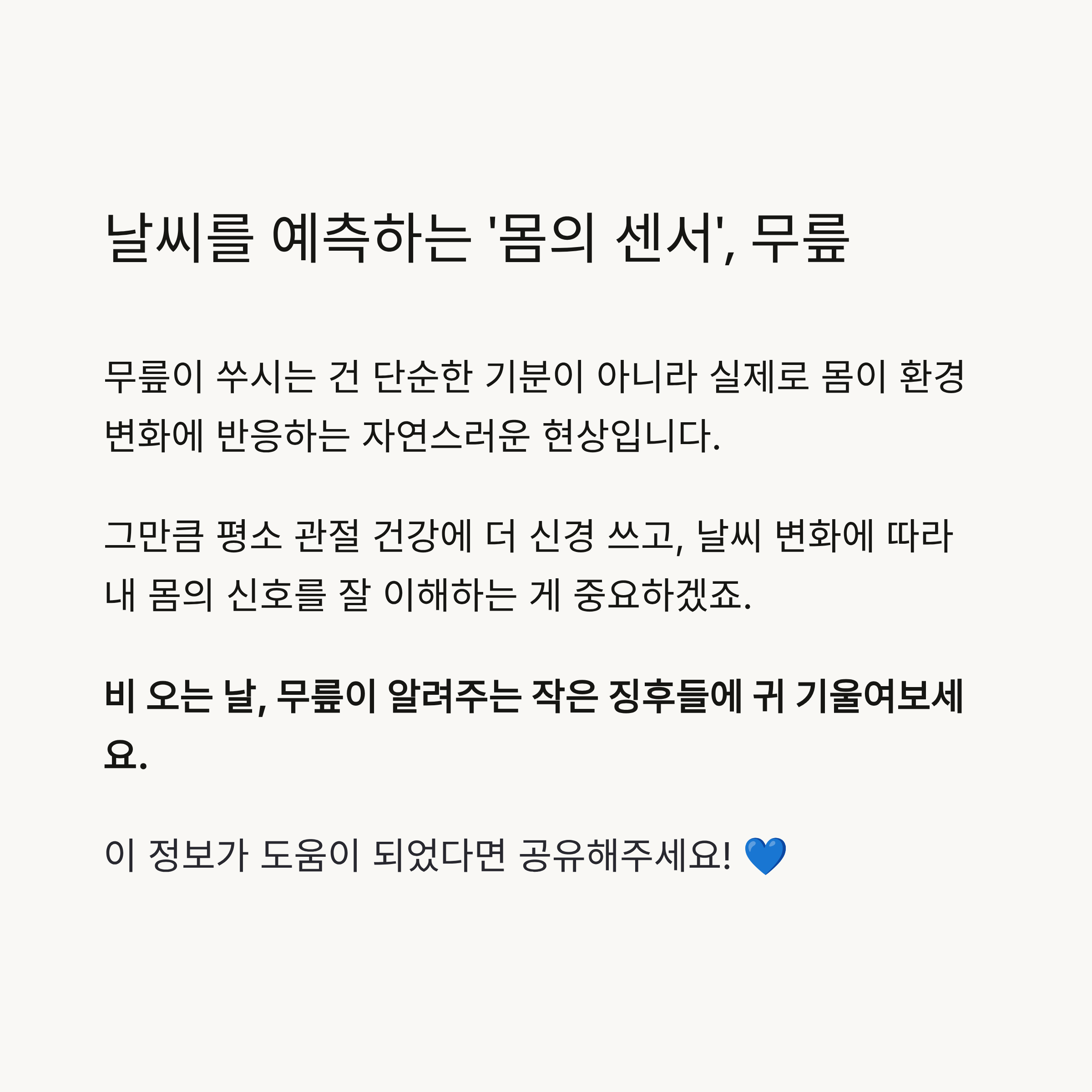 그만큼 평소 관절 건강에 더 신경 쓰고, 날씨 변화에 따라 내 몸의 신호를 잘 이해하는 게 중요하겠죠.