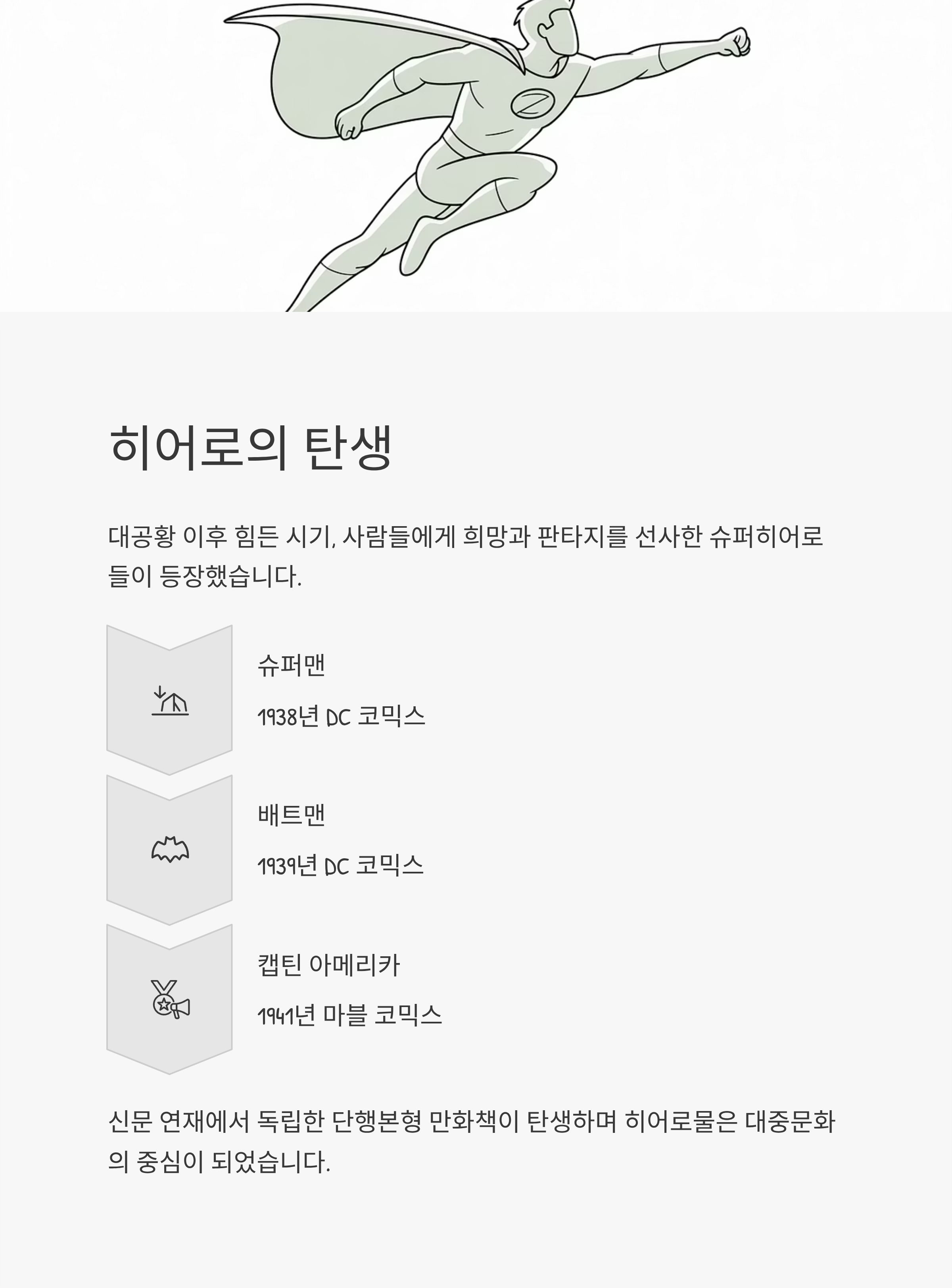 | 1930~1960 | 코믹북 | 슈퍼맨, 배트맨 | 히어로물 탄생 |