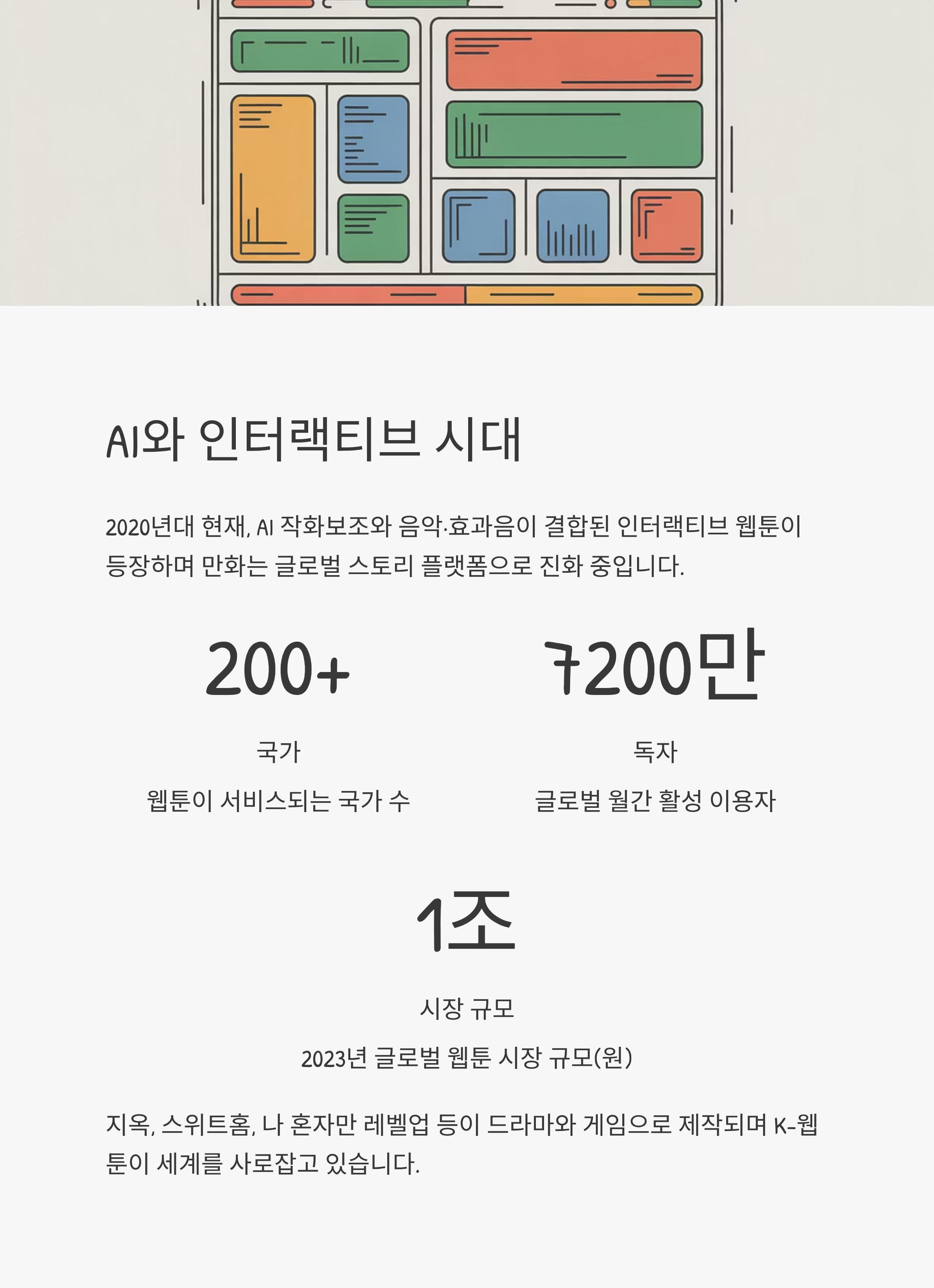 - AI 작화보조, 채색 자동화, 인터랙티브 웹툰(스크롤 따라 음악, 진동, 효과음) 등장