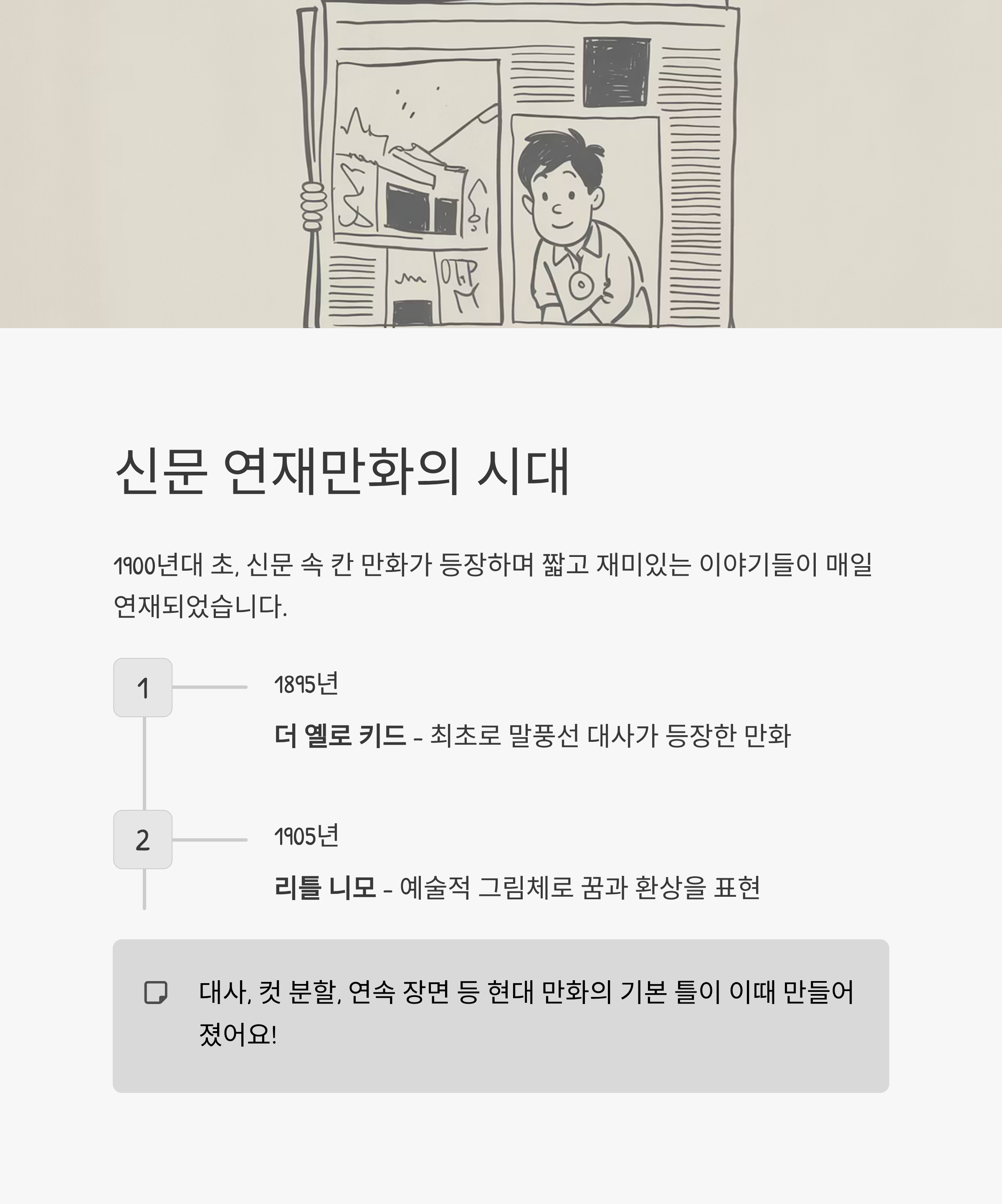 | 1900~1930 | 신문 연재 | 더 옐로 키드 | 말풍선·컷 도입 |